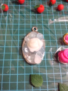 銀プレートの上に荒目サイズのアクアマリンを接着しその上に白い樹脂薔薇を載せました。