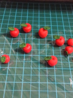 ちま林檎!葉っぱはサイズ的にも押し型がないので1枚1枚千枚通しで模様を付けました。これもお嫁に行く予定です。いくつかイベント用にも作りたいとは思っています。